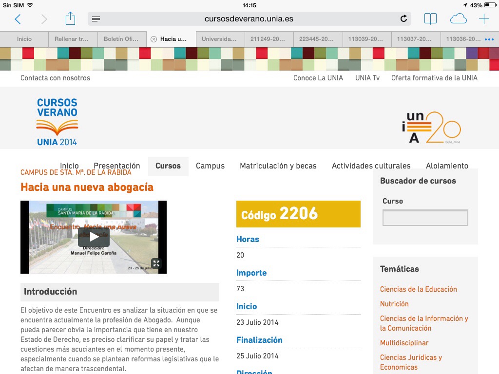 Los próximos días 22 y 23 de julio me han invitado a participar como ponente en el curso de verano de la Universidad Internacional de Andalucía llamado “Hacía una nueva Abogacía”. Compartiré cartel con Carlos Carnicer, presidente del Consejo General de la Abogacía Española y otros profesionales y expertos a quienes hace tiempo tengo deseo de escuchar. Mi ponencia es el 23 por la tarde y no deja de sorprenderme el interés que despierte nuestro colegio en las más diversas instituciones.