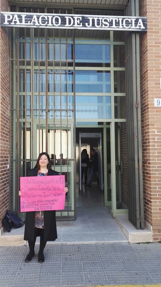 En principio no había nada planeado por la Red en Talavera de la Reina; sin embargo, Mari Carmen, no iba a dejar pasar la ocasión de ser útil a la causa y se fue con su cartelito al juzgado… y no, no estuvo sola; porque como veis en la segunda fotografía pronto otros compañeros se unieron a ella. Os aseguro que la próxima vez —y será pronto— Mari Carmen volverá a los juzgados de Talavera y esta vez irá rodeada de muchos compañeros.