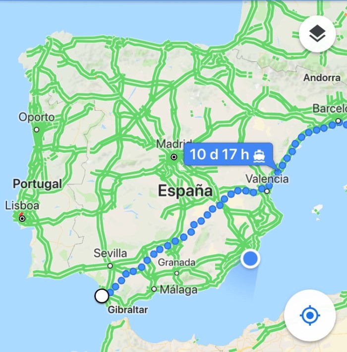 Trayecto más corto entre Cádiz y Roma según Google Maps.