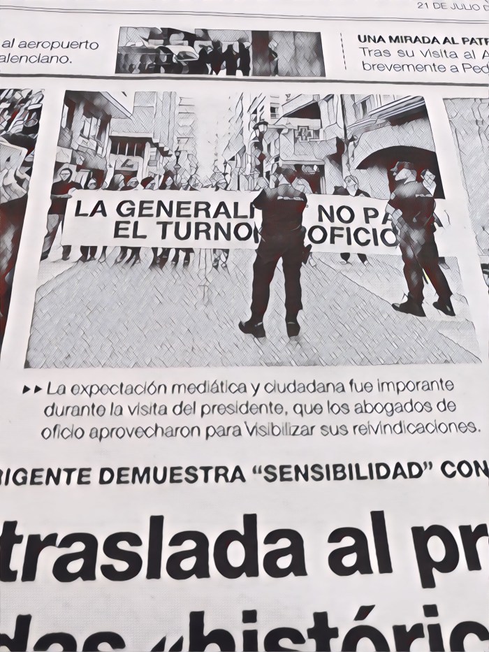 Cuento todo esto porque ayer un grupo de compañeros y compañeras decididas y audaces visibilizaron una vez más en Castellón los problemas de la justicia gratuita en España aprovechando la reunión que el Presidente del Gobierno de España y el President de la Generalitat Valenciana mantenían en dicha ciudad. Con extremada rapidez se reunió un grupo de compañeros y compañeras que desplegaron en el lugar de la reunión una pancarta denunciando los impagos de la Generalitat, pancarta que fue vista no solo por los antes aludidos presidentes, sino por el numeroso público allí congregado y hoy por la audiencia de muchos medios de comunicación.