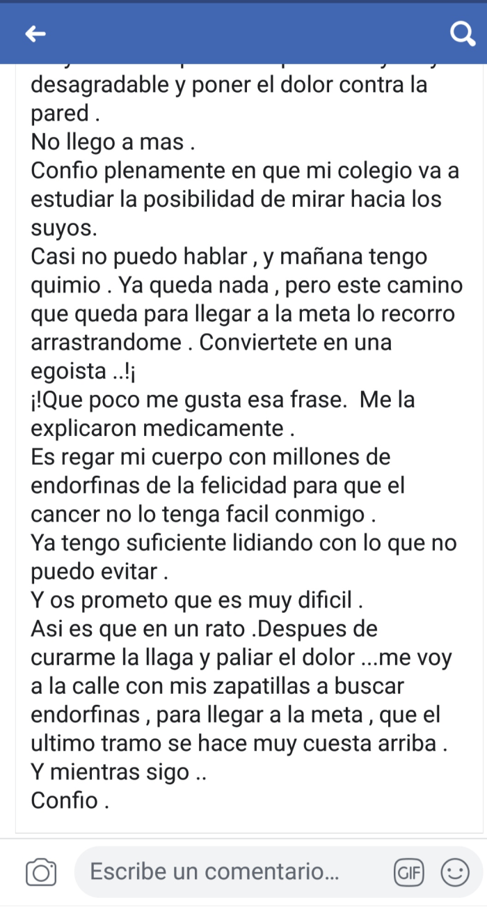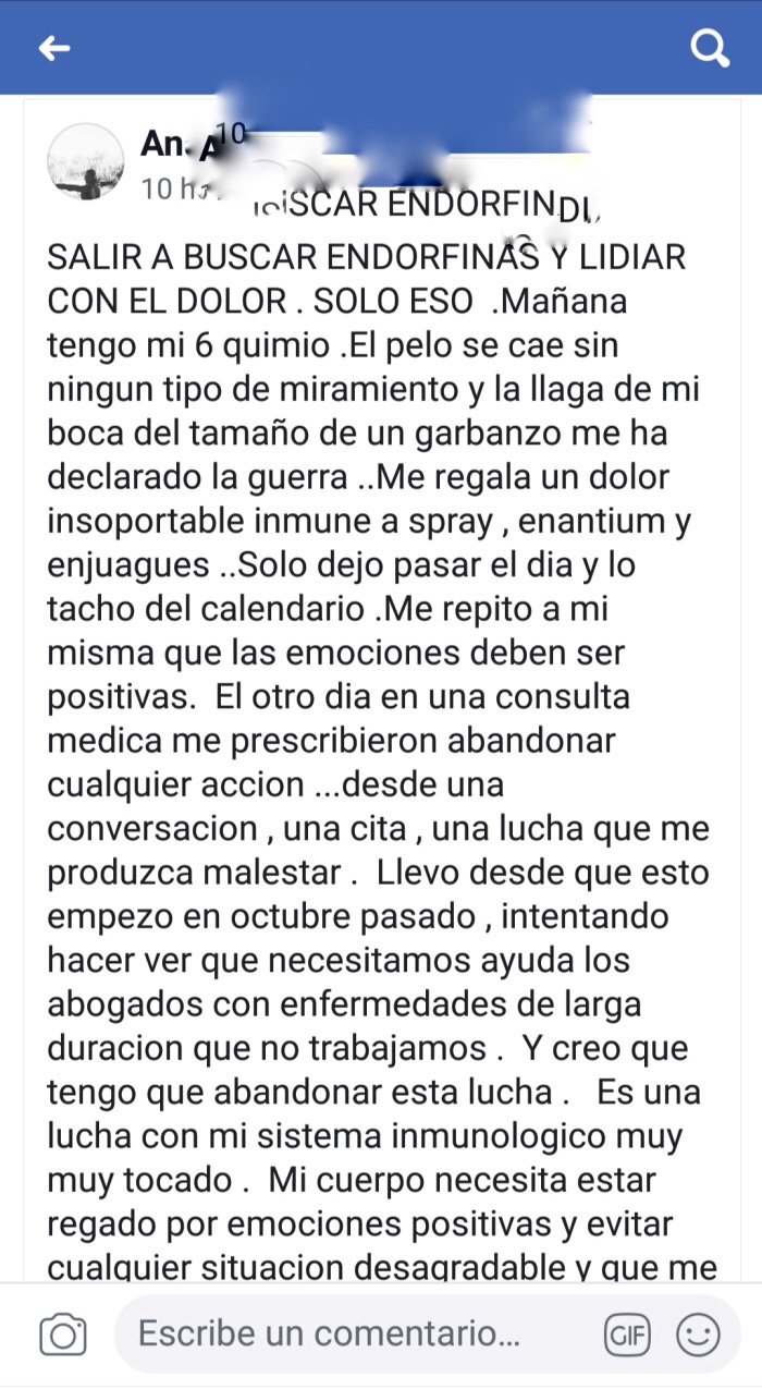 Ana tiene cáncer. Cada uno de nosotros enfrenta este tipo de enfermedades de una forma diferente; Ana ha elegido enfrentarla positivamente y sin ocultar su enfermedad, de paso ha tratado de que su colegio entienda que los abogados que ejercemos libremente la profesión en despachos tradicionales —un 85% de la profesión— necesitamos ayuda en este tipo de situaciones.