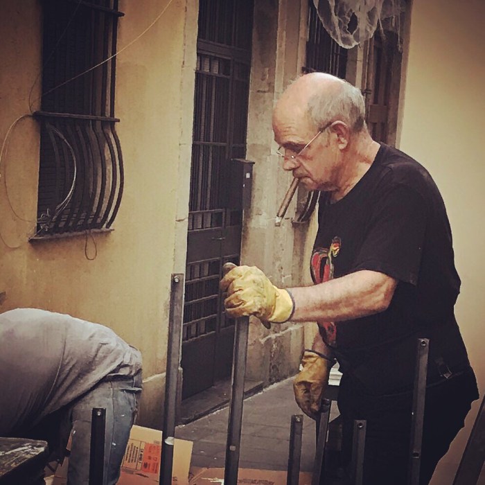 El barrio ejerce una atracción magnética para artistas e intelectuales y estos a su vez atraen a una clase alta deseosa de poder comprar algo de glamour para su anodina existencia. Las casas en Gràcia llevan años subiendo de precio y los solares y casas antiguas siendo oscuro objeto de deseo por los especuladores inmobiliarios. En las fotos de abajo podrán ver a Evelio, a Jordi, a María, a Claudia… los jóvenes ya no pueden comprar casa en el barrio de sus padres y ayudan en las fiestas como hicieron de niños pero, progresivamente, van siendo desarraigados del barrio como muchísimos vecinos más de la vieja Vila de Grácia.