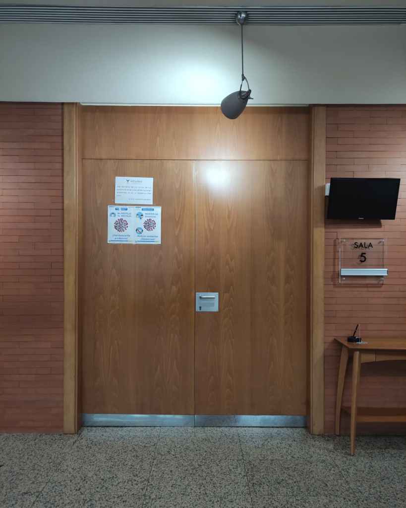 Es llamativo que no suele faltar en estas salas de vistas una puerta especial para el juez (ninguna ley impone esto) pero en muchos juzgados no existen puertas por donde ciudadanos esposados puedan ser conducidos a la sala sin ser exhibidos a la pública vergüenza de ser paseados con los grilletes puestos, ni existen salas ni puertas que permitan que los testigos no comuniquen o simplemente esperen sin temor a ser presionados o, incluso, sin tener que sentir la ominosa presencia de la familia y amigos de su victimario. Que quien ha diseñado esta sala no ha pensado en absoluto en los administrados es más que evidente.