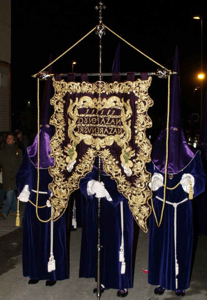 Esta noche, si no les llueve, los marrajos volverán a sacar su magna procesión a la calle y volverán a desfilar todos detrás del estandarte fundacional de su cofradía, justo el que ven en la foto.