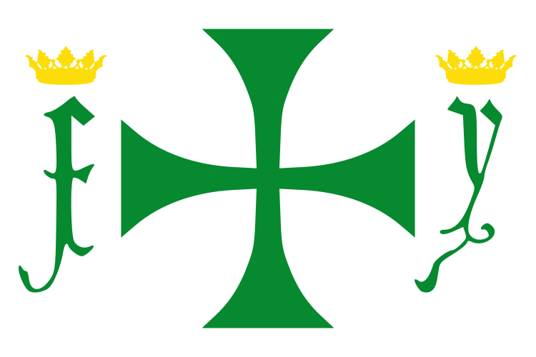 Así pues los navíos arbolaban banderas «de la Cruz Verde» con una F y una Y. Cómo era la cruz (de qué tipo era) es algo que no nos dice y que, por ello, merecería la pena investigar. Algunos quieren que la cruz sea de Malta, (supongo que por darle un toque templario), otros la pintan como si fuese del tipo «de la Orden de Cristo» lo que parece absolutamente fuera de lugar pues era propia de los portugueses, en Estados Unidos, por su parte, es muy popular en el «Columbus Day» una especie de cruz florenzada, mientras que, en la iconografía española, abunda la cruz patada (cruz cuyos brazos se van estrechando según se acercan al centro).