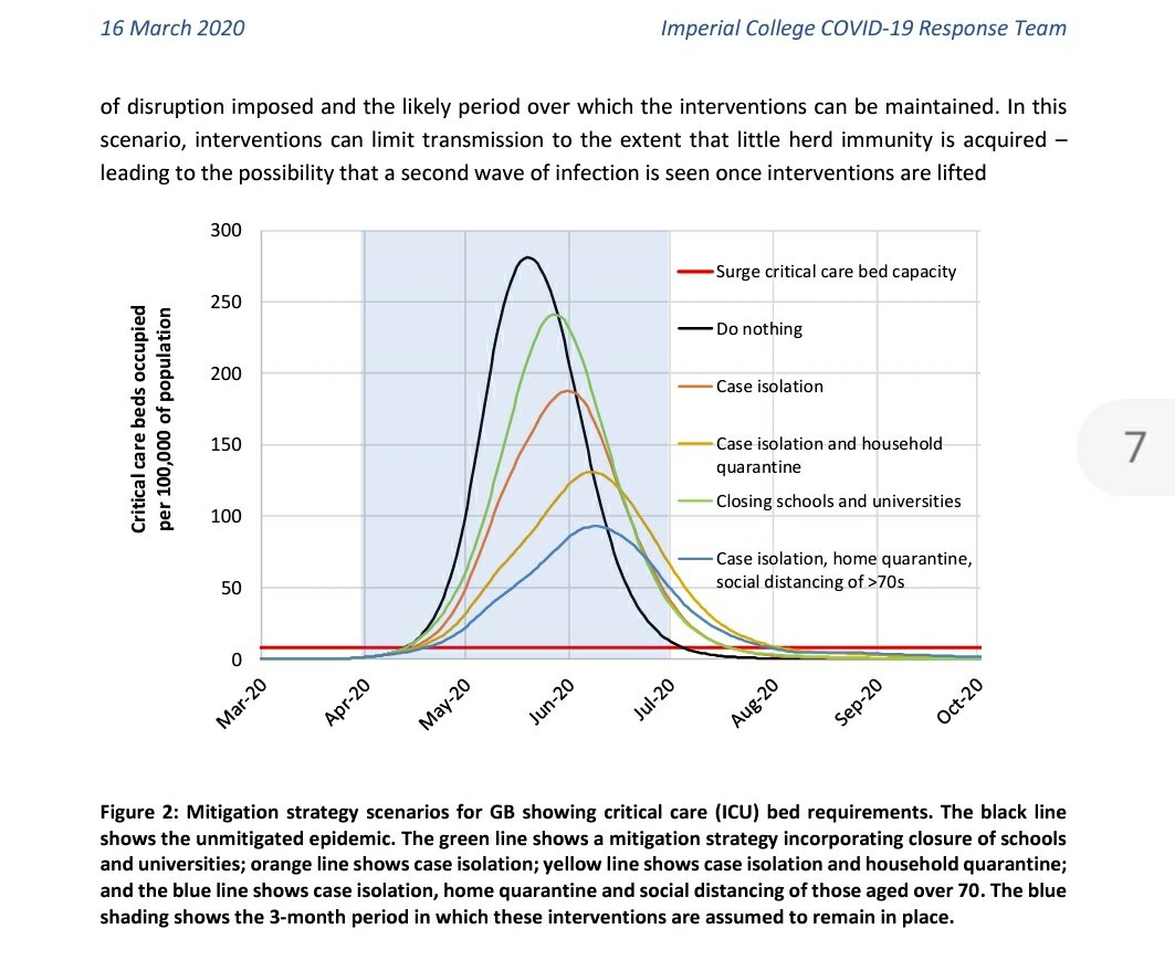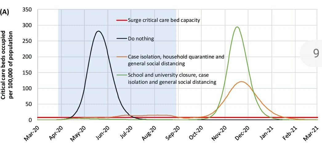 Según el modelo de estos investigadores, esa estrategia no lograría resolver el problema. Sin el alejamiento social de toda la población, el modelo predice que, incluso la mejor estrategia de mitigación, que significa aislamiento o cuarentena de los enfermos, de los ancianos y de los que han estado expuestos, además del cierre de escuelas, aún provocaría un aumento de las personas gravemente enfermas ocho veces mayor de lo que podría soportar el sistema de EE. UU. o de Reino Unido. (Esa es la curva azul más baja en el gráfico a continuación; la línea roja plana es el número actual de camas en UCI.) Incluso si las fábricas empezaran a producir más camas y respiradores y todas las demás instalaciones y suministros, aún harían falta muchos más médicos y enfermeras para atenderlos a todos y ofrecen este gráfico para visualizar las previsiones de su modelo: