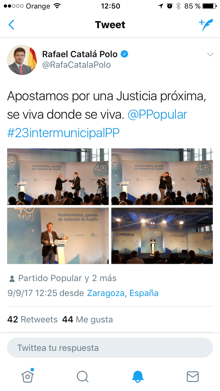 Ayer la cuenta tuíter del ministerio de justicia publicó el tuit que sigue a este párrafo, tuit que reproducía una frase o idea transmitida por el ministro de justicia Rafael Catalá Polo en la así llamada «vigésimo tercera intermunicipal PP». La frase contenida en el tuit era literalmente la que en él se ve: «Apostamos por una Justicia próxima, se viva donde se viva» y se quedó tan ancho.