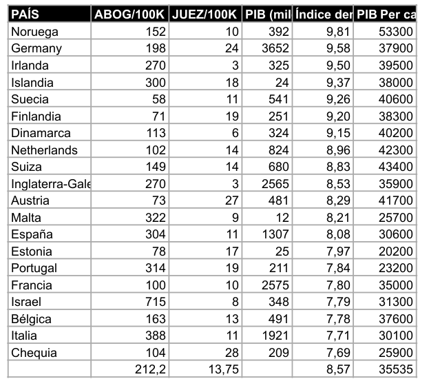 Me he tomado la molestia de recopilar los datos que nos ofrecen diversas fuentes para confeccionar la siguiente tabla donde, en la columna 1 se contiene la relación de países considerada por la Comisión Europea para la Eficiencia de la Justicia (CEPEJ) y se anota en cada uno de ellos el número de abogados existente por cada cien mil habitantes (columna 2), el número de jueces existentes por cada cien mil habitantes (columna 2), el PIB del país expresado en miles de millones de dólares (columna 3) según el «World Factbook» elaborado por la Agencia Central de Inteligencia de los Estados Unidos (CIA), el índice democrático (columna 4) que otorga la Unidad de Inteligencia de «The Economist» y el PIB per capita de ada país de acuerdo con el ya mencionado Factbook de la CIA.